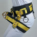 This saddle has four "D" rings and nylon leg straps. It comes equipped with two utility snaps and a utility ring with limited slip feature: the seat strap is designed to move or slip from side to side so that attachment dees are more aligned with the climbing rope.